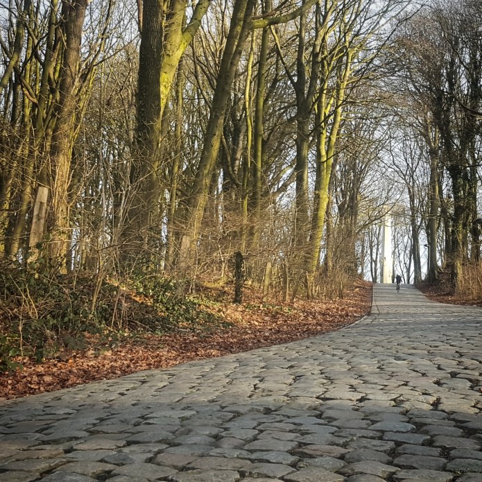 Across the river Leie again, back into Belgium. I recognise the Belgian side of town from the ride to Copenhagen in October We’re heading for the Kemmelberg, the cobbled climb famous from Gent-Wevelgem and Three Days of De Panne. For the first time in 120km the land starts to undulate, it starts to feel like Spring Classic country. We can see the Kemmelberg from miles away, it’s the only hill. It’s not high but from a distance it looks substantial enough. Gradually it nears. We approach on roads that narrow as they steepen, and then we turn onto the cobbles on the “easy” side, climbing to the memorial to French soldiers at the summit. We loop around to the bottom of the punchier steeper side. George climbs it. I decide to take a photo of him climbing it is sufficient, I’m starting to feel a bit bonkyfaint and dreaming of food.