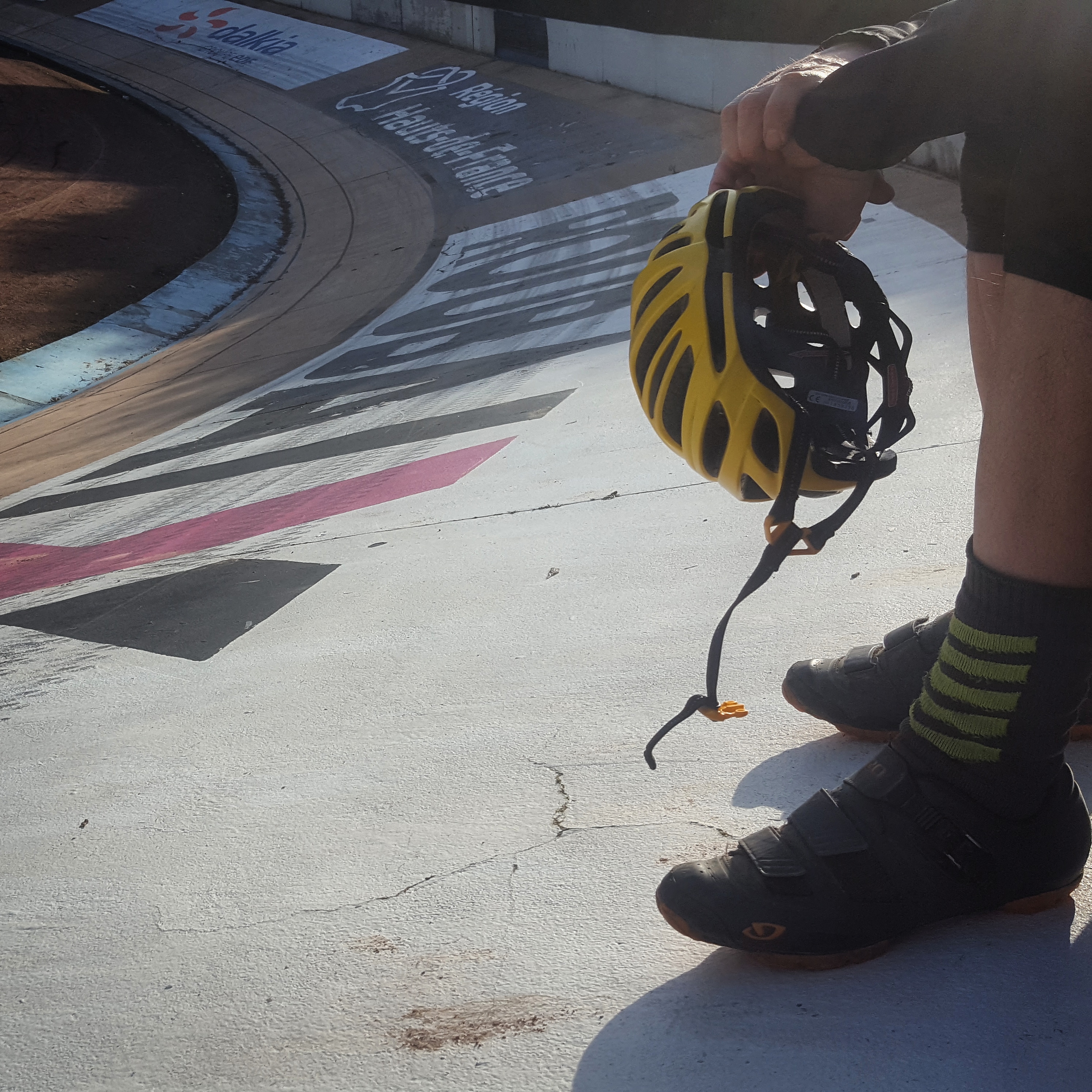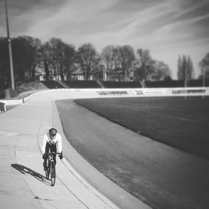 Back into the headwind towards Wevelgem, across the river Leie, and loop around to the east of Roubaix. Ice tea on the forecourt of a tiny petrol station in a town straddling the French border. We turn back to the north, out of the wind at last. Through a housing estate and bouncing across some kerbs we turn into the famous velodrome.
