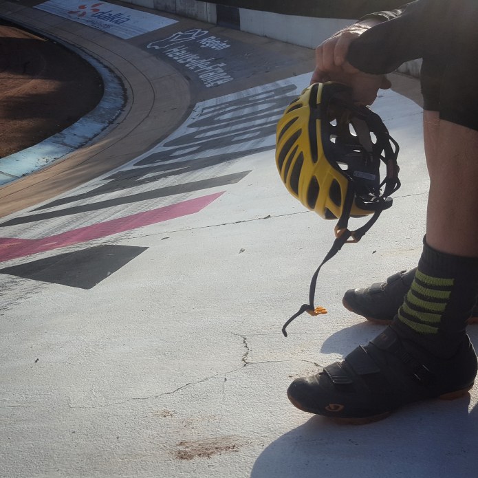 It’s empty and looks a little scruffy, but this is the place of legends. Today there are just some bored teens smoking in the top corners of the grandstand. We lap it a few times then climb to the top of the banking to sit in the sun. I remember the Roeselare pastry in my back pocket.
