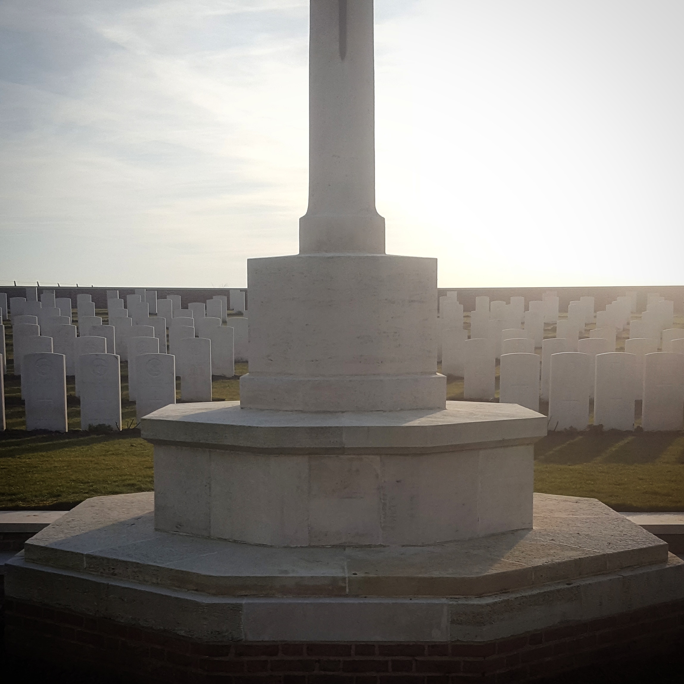 Starting off for Ypres we speed (downhill plus tailwind) through the narrow roads until George appears to be front wheel drifting around a fast corner. It doesn’t look deliberate which is confirmed by the exclaimed “Shiiiit!” He’s clipped a stone, punctured, and somehow managed to hold it without hitting the floor or sliding into the ditch opposite. Skills. Standing on the steps of the Kemmel No.1 French Cemetery I delve into a jersey pocket for an inner tube.