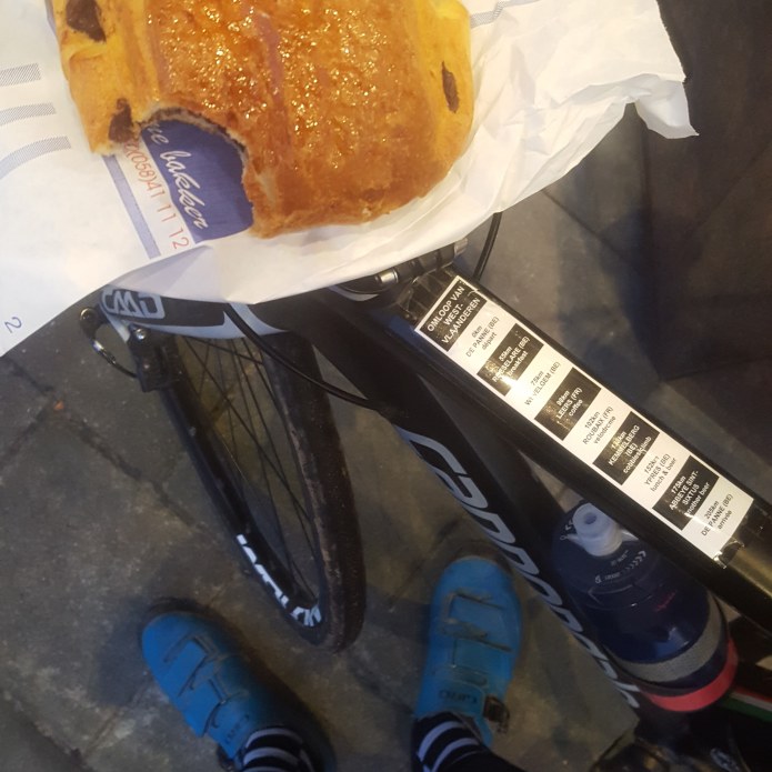 A bit further on we enter the city of Roeselare which seems to be entirely shut. I had planned this as coffee stop number one. Out with the phone and Google Maps to the rescue, seems there should be a bakery close to our route out of town. We turn onto a side street and can’t see anything obvious but then spot the word Brood above the big wooden door of an imposing looking building. On the steps is a black board with the word Open written in chalk. I lean my bike against the wall and try the door. Inside I find a fine bakery with a coffee machine. Yes! Caffeine!