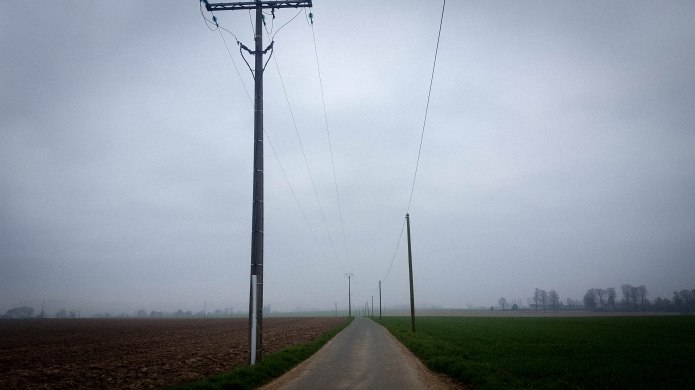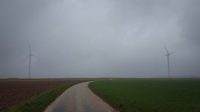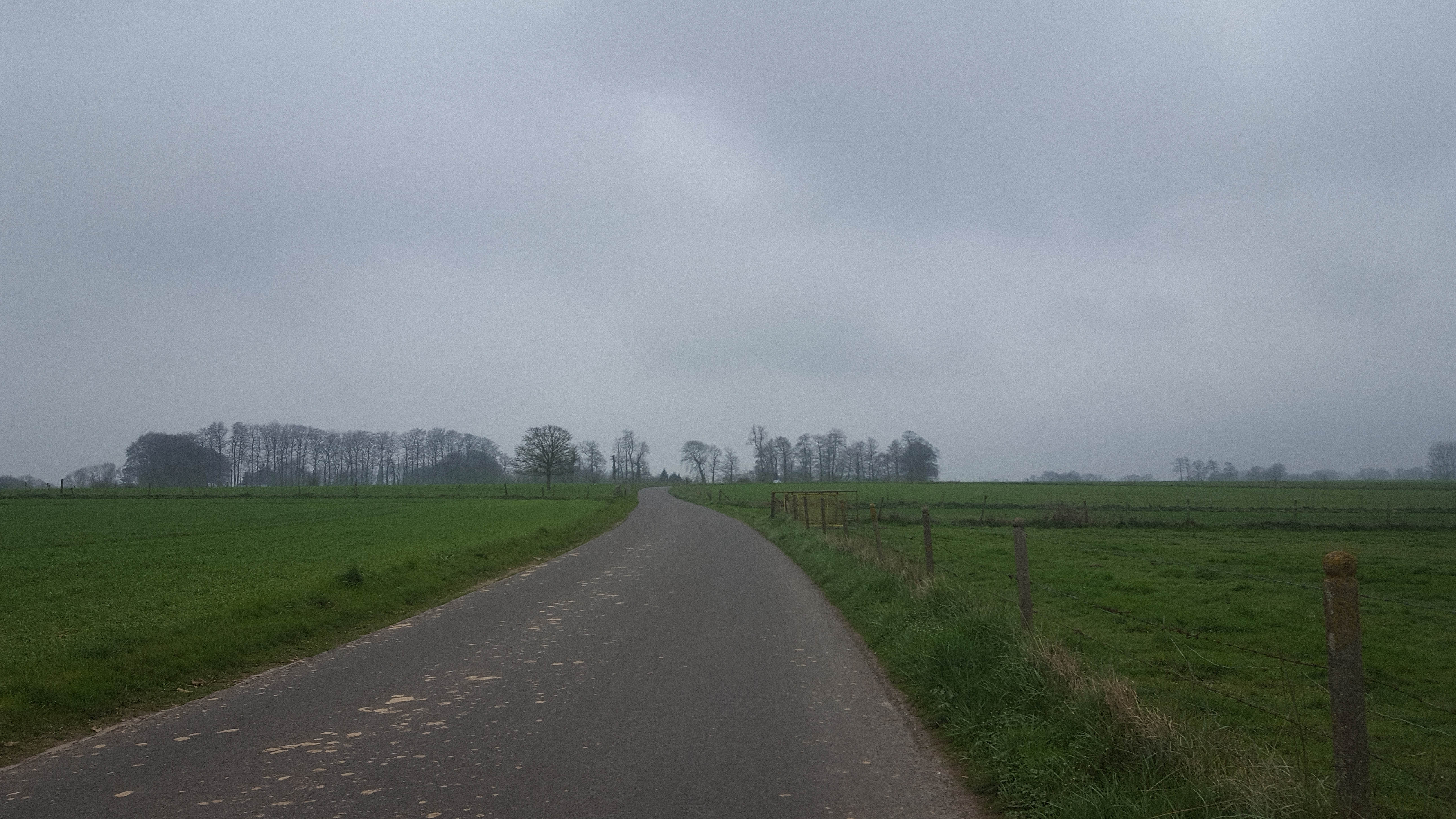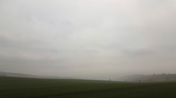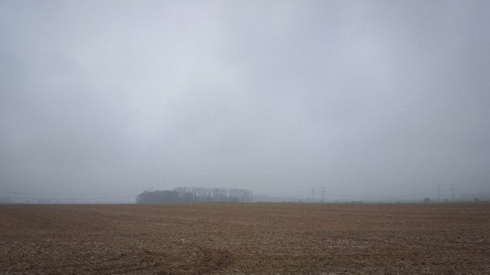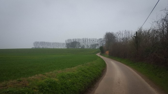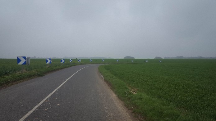 Horizons are as lonely as they are wide, broken only now and again by rows of trees, telegraph poles, or the occasional wind turbine. Quiet roads drift across agricultural land, the gentle curves of the road mirroring the slight rise and fall of the landscape. I drop in and out of shallow valleys where rivers flow north to the Channel; La Scie, La Saâne, La Vienne, La Durdent. I’ve not seen a car for hours. It’s so peaceful I can hear a bee in a field. A skylark disguises itself in song. Electricity cables fizz in the air above, pylons marching south across the fields. Birds scatter into the air from a bend in the road. Small villages with huge churches. A route that double backs on itself, almost crossing itself but not quite touching, the same place names repeated on signposts hours apart. Doudeville appears many times, I must be circling it. No hedgerow to break the flatness, grass becomes road becomes ploughed earth. A field of rape just turning yellow. Unclip a foot and let the tractor pass, returning a nod and wave to the farmer.