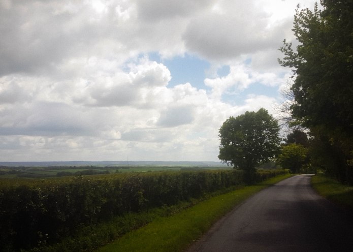Out of Chinnor the first of three proper climbs. This first one not so bad, up onto a ridge with a long fast ever so slightly downhill section before plummeting into a valley and steeply crawling back out the other side. That one was cheekily steep. The pattern repeats; another false flat road following a ridge then in and out of a valley. The Garmin battery is running low so I stop to charge it on a village green (I’ve knackered the USB port so charging on the go is a bit iffy). Looking eastwards I see dark clouds rolling in. I reckon about 18km to go, I’m not going to outrun them but I can try…