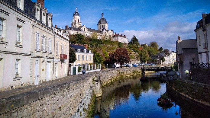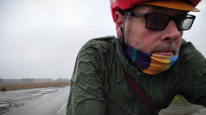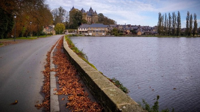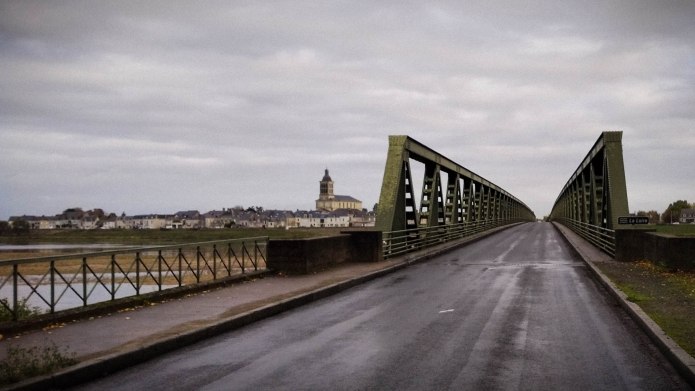 Hammer the breakfast buffet and snaffle a few things for the musette. Dry my tights with a hairdryer. Following the southern edge of the Loire I head west, the banks of the river often right next to the road. There are indications that historically this was an afluent area, lots of big houses pretending to be chateaus as well as actual chateaus. Everything feels a little posher and less rural that the last few days. More roadworks, the detour cut short with some offroading through a vineyard. Crossing to the other side of the river the roads are damp and the air smells of wet grass. I must be following the bad weather today rather than being chased. I transfer from the Loire valley to le Maine at Angers where the roads get busier. The city is a sprawling nondescript mess and it takes what feels an age to pass through and escape it’s orbit. A very near miss with a car driver not paying attention on a roundabout. We both skid to a halt. I give them a look that can very easily be translated into French.