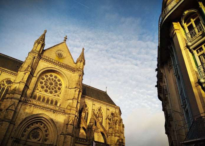 It rains for two hours, all the way to Chatellerault but the sky breaks with bright cracks as I drop into town, pulling into a bakery for lunch. Salad and coffee for now, a sandwich for the musette. A TV shows another weather forecast, black & white clouds cover this part of France, but no rain drops. Hopefully I’ve had all the rain I’m going to have.