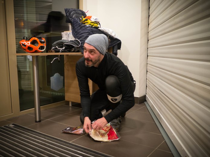 The first sixty kilometres were great, initially heading west across a few river valleys before turning back towards Dieppe to then venture east. From the port we wiggled through the dark streets, Christmas lights sparkling from shop fronts and lamp posts, and climbed to the outskirts of town. We dropped down to the Scie valley and followed the river south for a handful of kilometres then turned up onto the empty blackness of the plateau between it and the next valley, the Saane. A still and silent dark surrounded us, no difference between land and sky, just the road ahead made visible by our lights. Sweeping down to the river Sâane we turned south again as far as Sâane-Saint-Just before returning towards the Scie north-east back over the hills. Sitting in the warmth of a cash machine lobby in Bacqueville-en-Caux George pulled chorizo and wraps from his bag for breakfast, or at least to keep us going until the patisseries started to open. From there we rode on to Arques-la-Bataille where I knew there should be a couple of bakeries and a couple of bars that should be open by the time we arrived.
