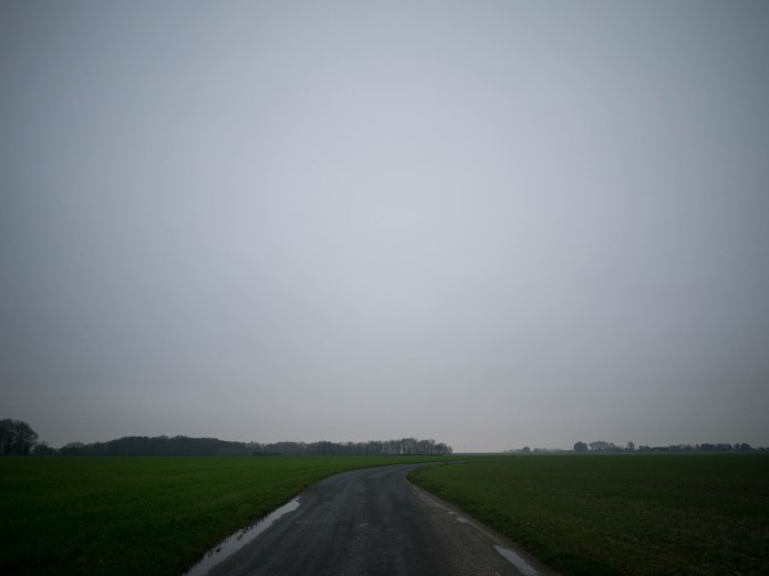 The lilac tint of dawn had faded to a lifeless blank grey, the views around me flattened by the mute light, shapes softened, greens and browns subdued. It’s not inspiring weather but it’s not unfavourable, relatively mild and still. My legs still weren’t working very well as I left the main road for a narrow lane through rolling farmland but I had a handful of optomistic kilometres when the road flattened, spinning along at pace comfortably and speeding down the flowing descent from Fresnoy-Folny. Then I hit the long climb out of Grandcourt.