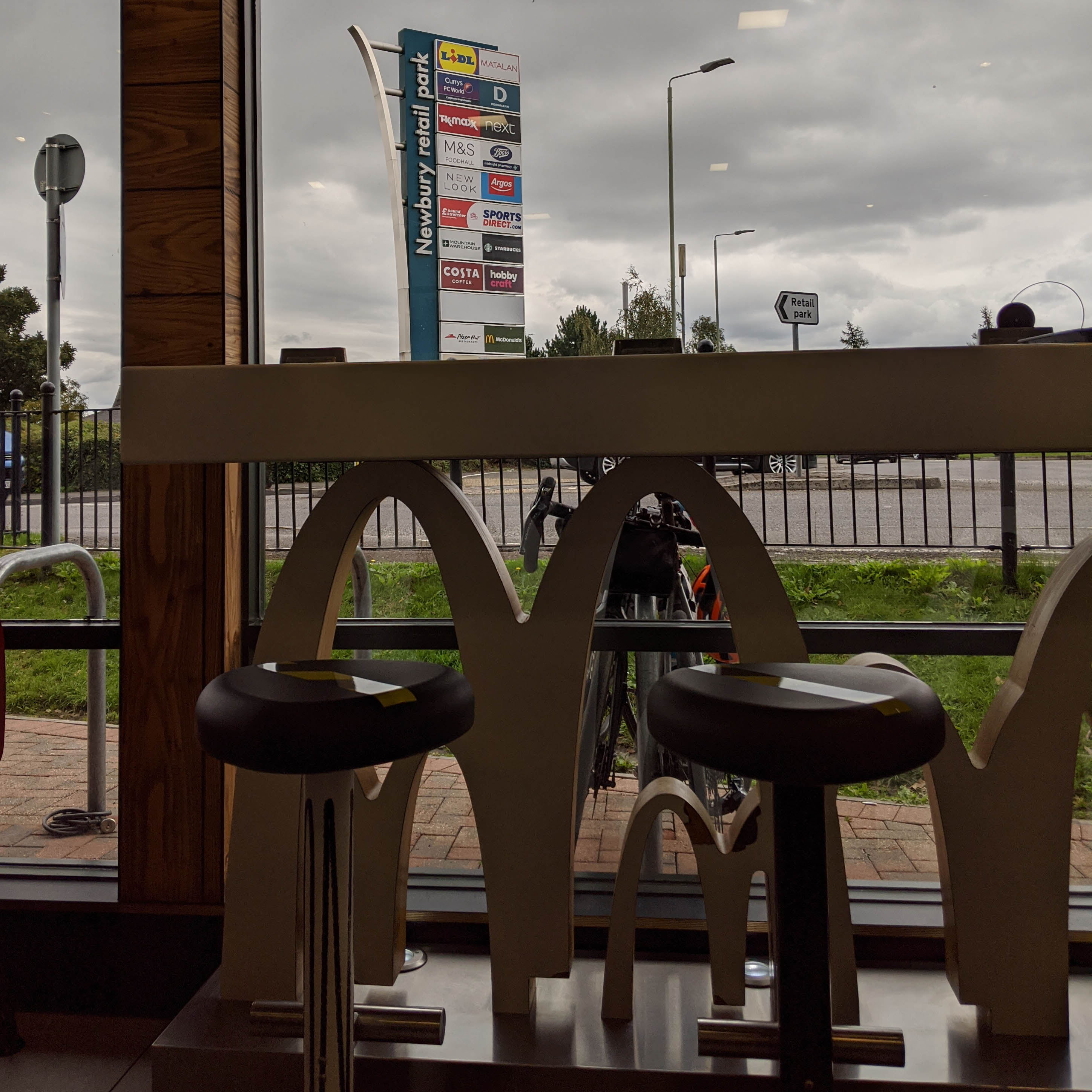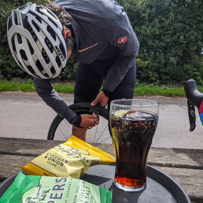 Two pints of coke, two packets of crisps, lots of chat. Our schedule is slipping and neither of us are entirely convinced we’ll get all the way round anyway but we’re having a fun day. Despite being in a busy part of the south-east crisscrossed by A-roads and motorways our route has been on beautifully quiet lanes, we’re enjoying unfamiliar places and the changing landscapes. The only sign of towns being the names on actual signs. It’s been a day of chat and laughter so far. We’ll head for the next scribbled-on-a-bit-of-paper-in-my-wallet stop at Newbury, about thirty kilometres away. We’ll decide what to do there as once past there bail options get trickier.