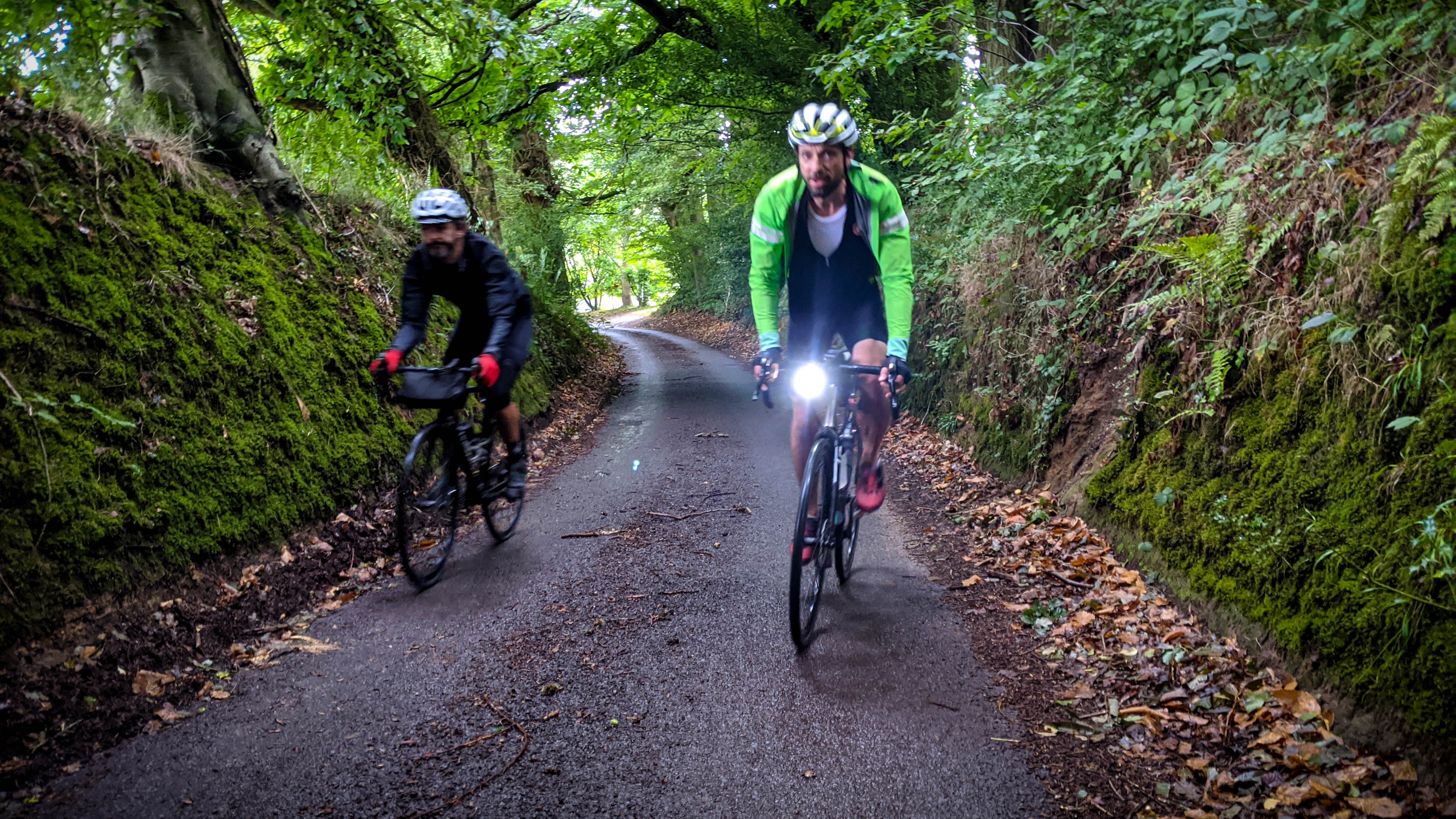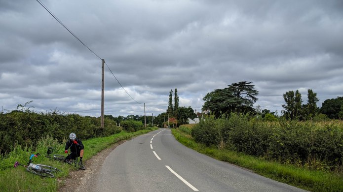 Ticking along nicely towards Billingshurst I abruptly notice I’m being sprayed by tubeless jizz from George’s rear tyre. Cue much innuendo. The tyre seals before too much air is lost and the first stop is planned when we get to Billingshurst in a couple of kilometres anyway. We’re bang on schedule. Coffees are purchased and a tyre reinflated. A short blast along the A272, pleasantly quiet as it’s still early, gets us to Wisborough Green and gently rolling roads and peaceful lanes with lots of tree cover from the wind.