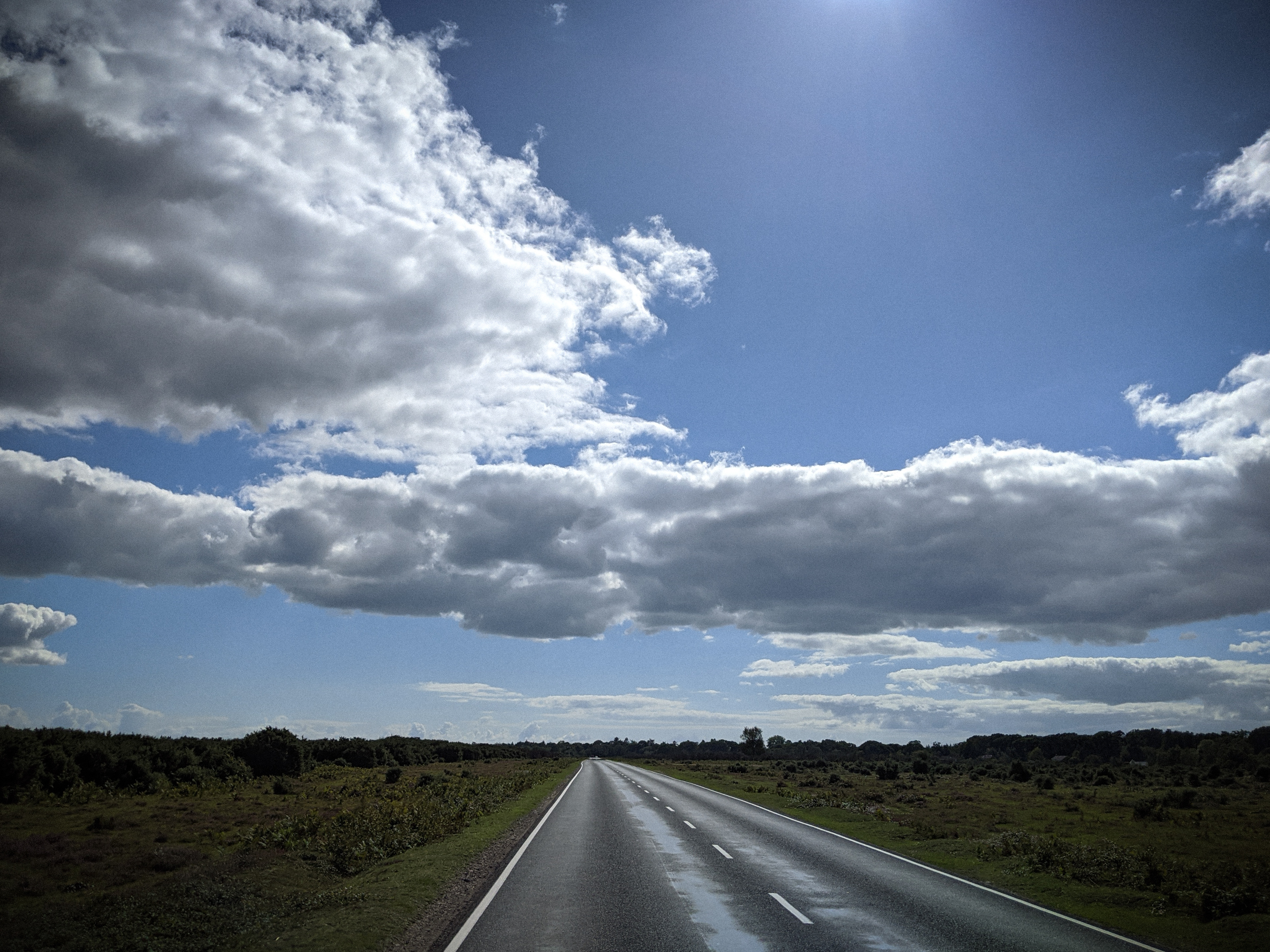 To avoid roads I’ve ridden a lot in the past and the dull suburbia of the south coast I jumped onto a train this morning to Southampton where I caught the foot passenger ferry across the Hamble to the edge of the New Forest, where the skies are big and there’s no hiding from the wind. Over the top of the forest the Isle of Wight appears on my left reminding me it’s an option for the return journey next week. Cattle grid rumble and pony tails swish against bracken on the turn, the year is rotating into autumn. Signalling right I change course northbound and the road narrows and trees arch overhead, branches and leaves create a verdant interwoven ceiling. Climbing slowly until both the landscape and sky open wide again, the wind making its presence felt once more. Back in the trees a fallow deer stutters in the middle of the road, turns and squeezes back through a fence. Horses and cows are less jittery and have to be swerved. Dropping into Wiltshire I trace the Avon to Salisbury, through the city, past players casting long shadows across a cricket green, the sun low in early evening another indication that summer has faded. A city where rivers meet I cross the Wylye north of Salisbury but pick up the Nadder west until I find my pub B&B nestled on the bank of the river. Shower, Tour De France highlights, dinner and a pint.