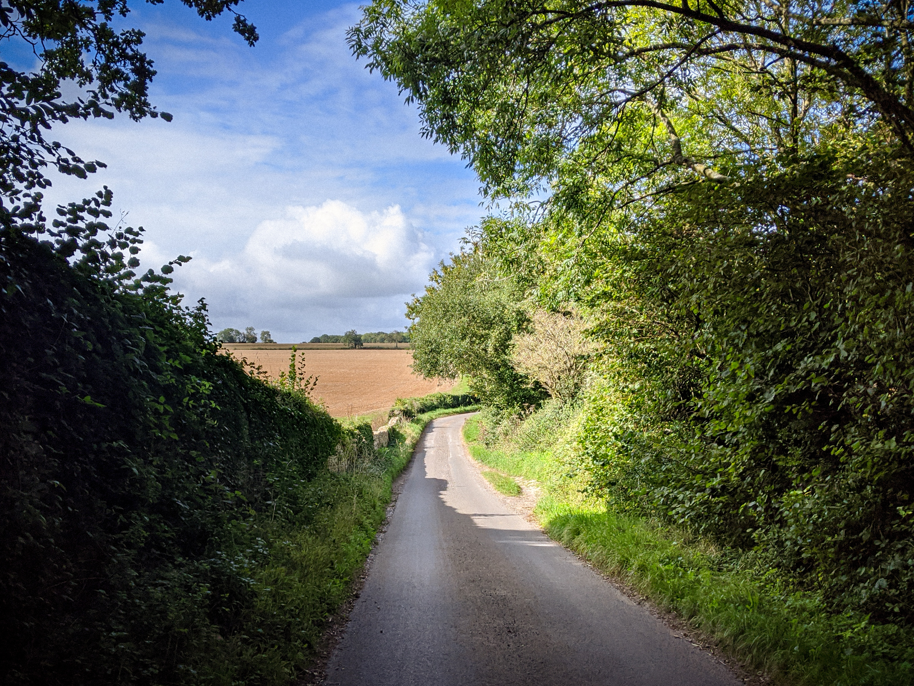 Early the next morning I start along the gently rolling Nadder valley, sticking close to the river, the blue squiggle on the GPS given a reality by tree lines twisting and turning across the flood plain. I cross a stone bridge and the road starts to rise, signs indicating Lower, Middle and Higher Coombe hinting that I may be climbing for a while. I hit Shaftesbury an hour or so after setting off, time for breakfast. A sandwich, coffee, and Pastel de Nata on the high street listening to the church service over the way. Hovis hill and some faff getting out of town, a steep drop to a lovely flat section of Dorset under blue skies. An enormous buzzard, the biggest I’ve ever seen, swoops across a field ahead. A minute or two later I pass an aerodrome for model aeroplane enthusiasts. A miniature wind sock flutters in the wind and my giant “buzzard” splutters on the landing strip.
