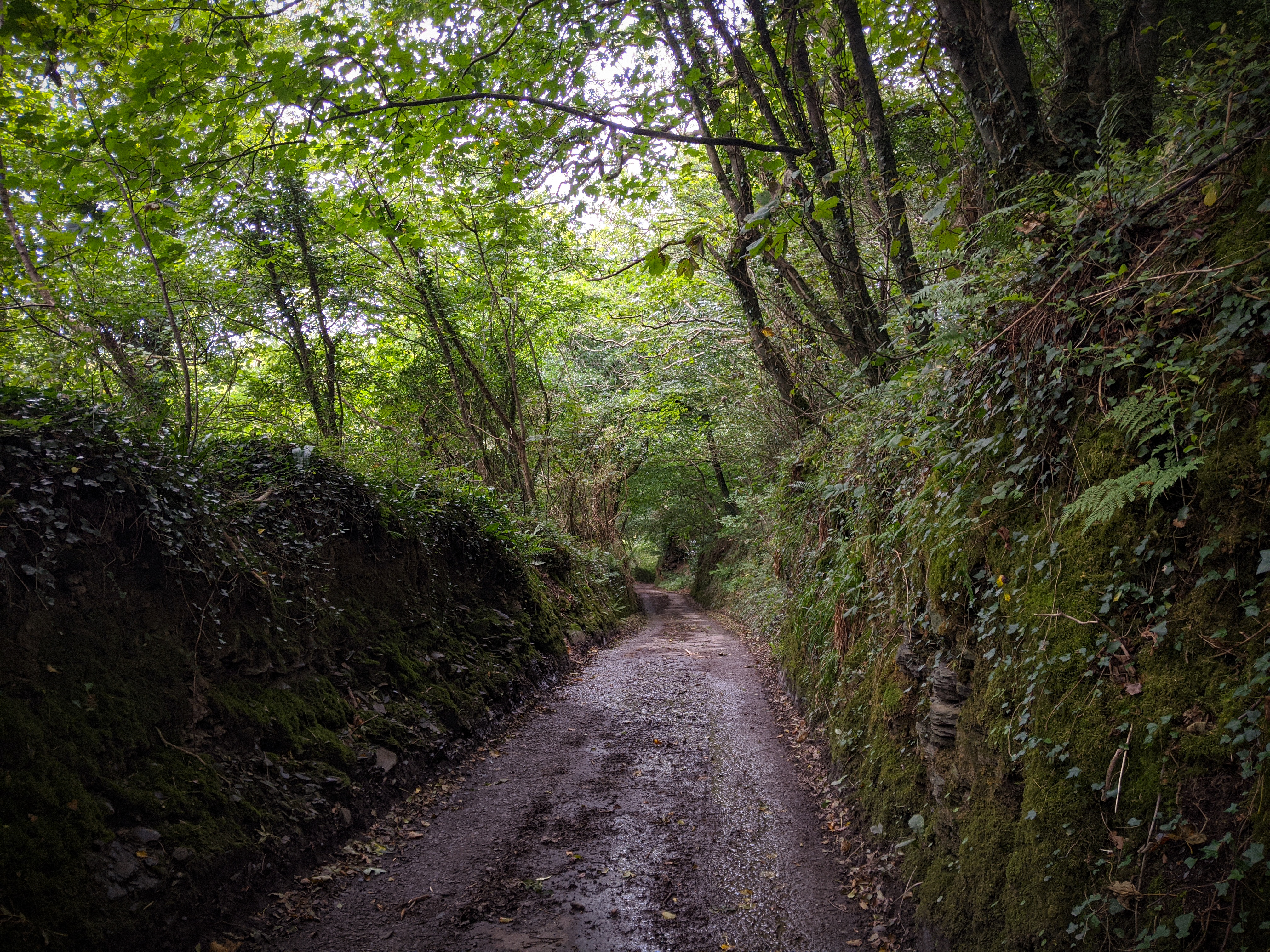 A steep wooded descent jettisons me across the Tamar into Cornwall. Straight up an equally vicious climb into rain. A fast road covers some distance quickly before I turn into the quiet in-between lanes towards Bodmin Moor. The numbers on my Garmin indicate I’m climbing but there’s a sense of burrowing into the land. Lanes where hedgerow are taller than the road is wide, holloways where even standing on the pedals the base of tree trunks are above my head, roots, moss and earth surround me. I’m venturing into a subterranean realm, swimming through green filtered light, sunlight speckles dancing beneath my wheels, the only sign that the sky is brightening.