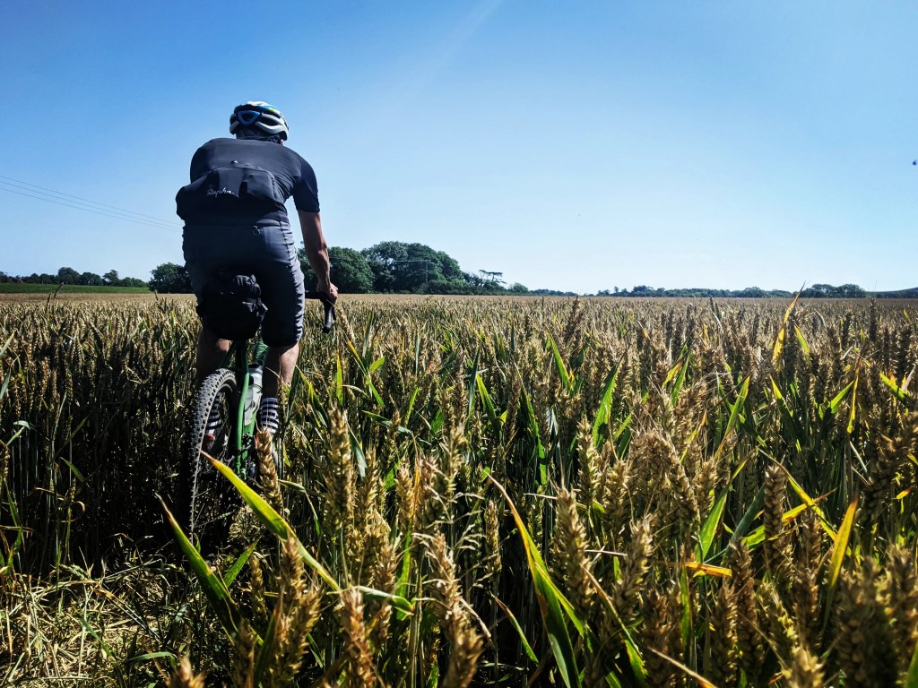 We sweep down from the opera singer’s house past Virginia Woolf’s to the Ouse flood plain, the first of our Ravilious rendezvous. A heron nonchalantly flaps overhead. The riverbank into Lewes is beautifully overgrown, my shins whipped by wild grass and flowers. Butterflies skitter about. We’re the wrong side of the Ouse for the Ravilious view, I think it’s from under Caburn but will be obscured from our eyes by the A27. We track the noisy dual carriageway, a glance left for his painting of the farm in the curves below Caburn, and then tuck ourselves under the road alongside Glynde Reach into Beddingham and to The Lay. This is part of the old ways before the A roads were bulldozed through. The shaded track to Furlongs is waterlogged and muddy, tyres slipping. In my head I see his caravans on the side of the track.
