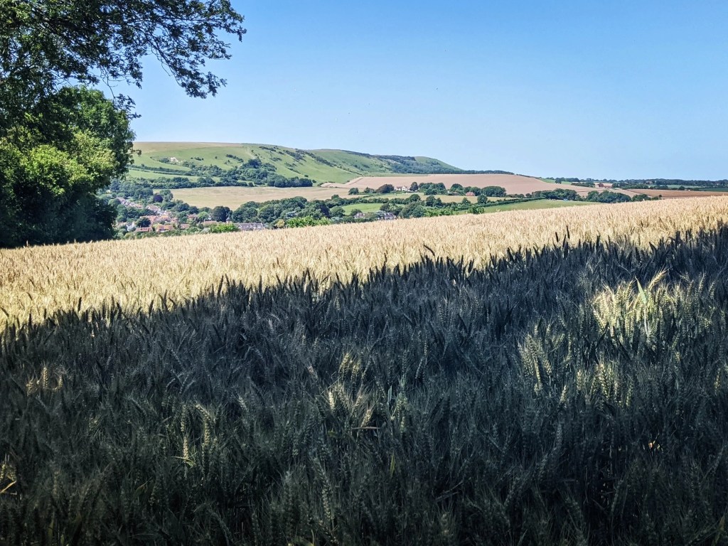 Then something happened when I started to spend a lot of time on the Downs. Those subdued shades of his paintings are the colours of the Downs during winter and shoulder seasons. The South Downs are soft and low, “seen from a distance, it seems to ebb and swell like the ocean from which it once emerged”*. In high summer blinding sun in enormous empty skies flatten the view, all becomes line and pattern. “The design, so beautifully obvious” in the artist’s own words. Slowly Ravilious started to make sense, the thin paint a metaphor for the barely there earth that just about covers the chalk: As Christopher Neve wrote in The Unquiet Landscape he painted with “an almost empty brush which allowed the white of the paper to glitter through”. Pencil lines and crosshatching visible through the watercolour mirror reality, the mark of plough and crop. “In this place he had perfect pitch.”