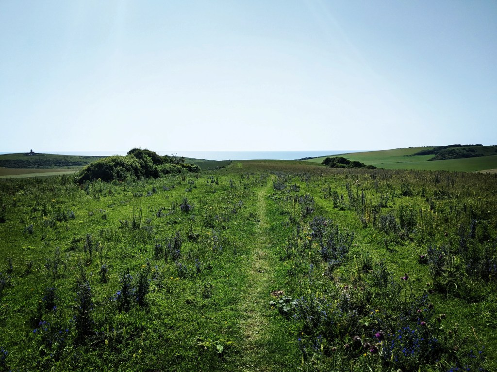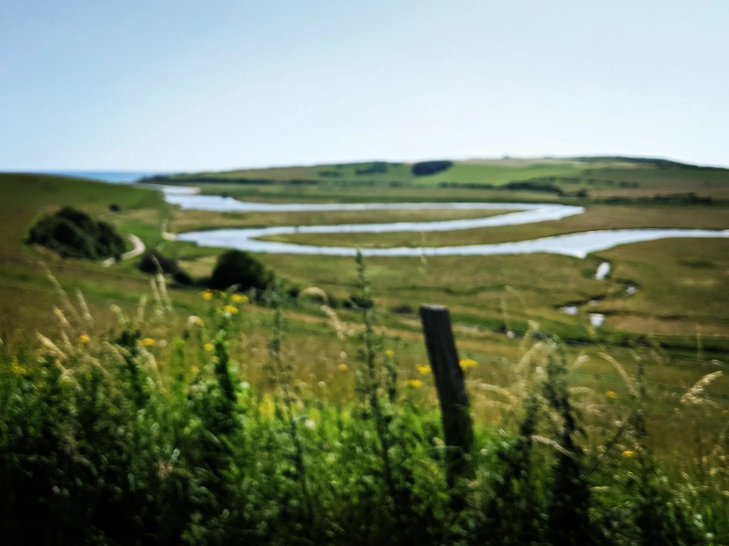 Leaving the Towner we climb back up to where the Downs literally fall into the sea at Beachy Head. Avoiding the road we ride a bridleway slightly inland and parallel to the coast, Belle Tout visible all the way. Having seen his painting of the Cuckmere Meanders a little while before we speed down the descent with this view to our left.