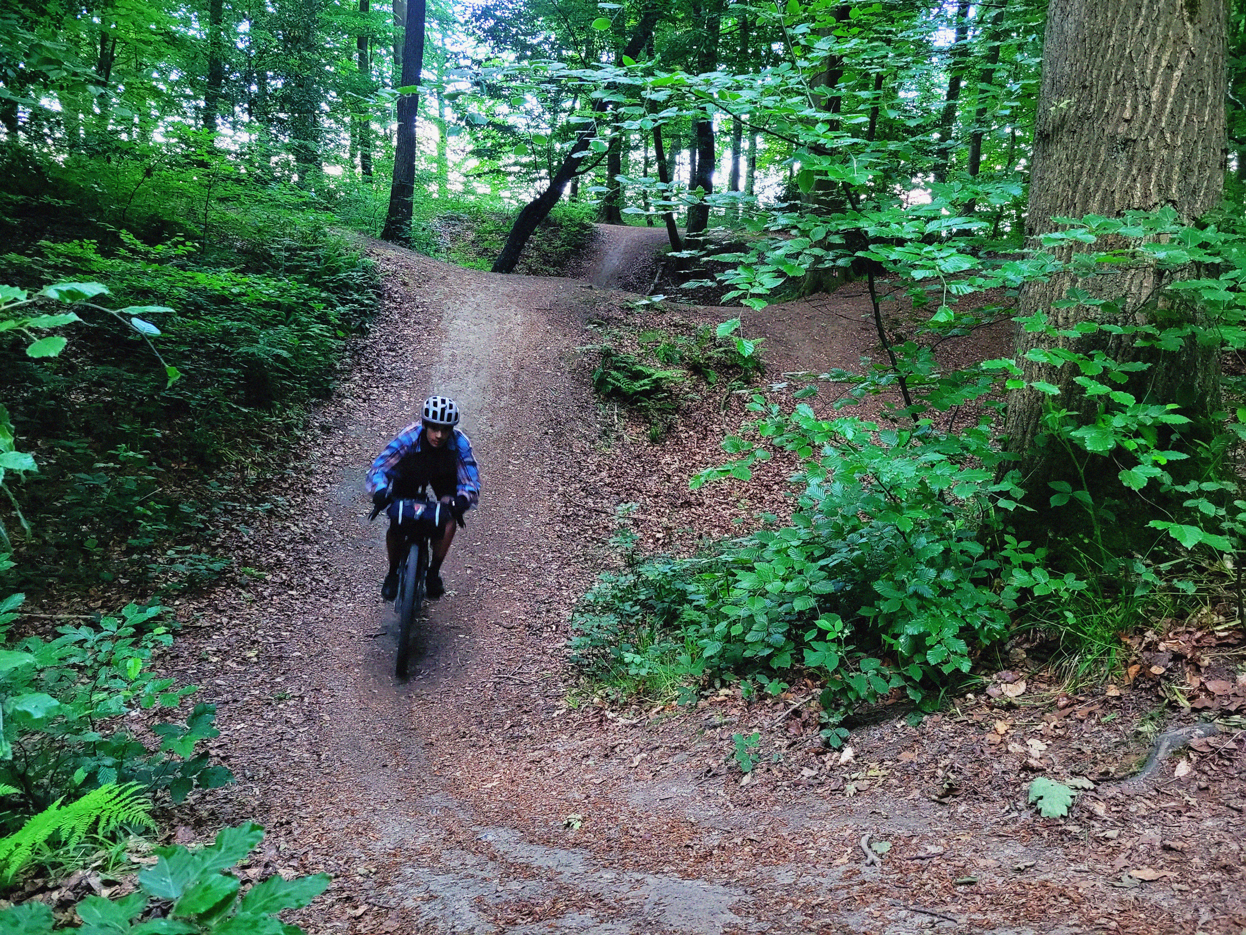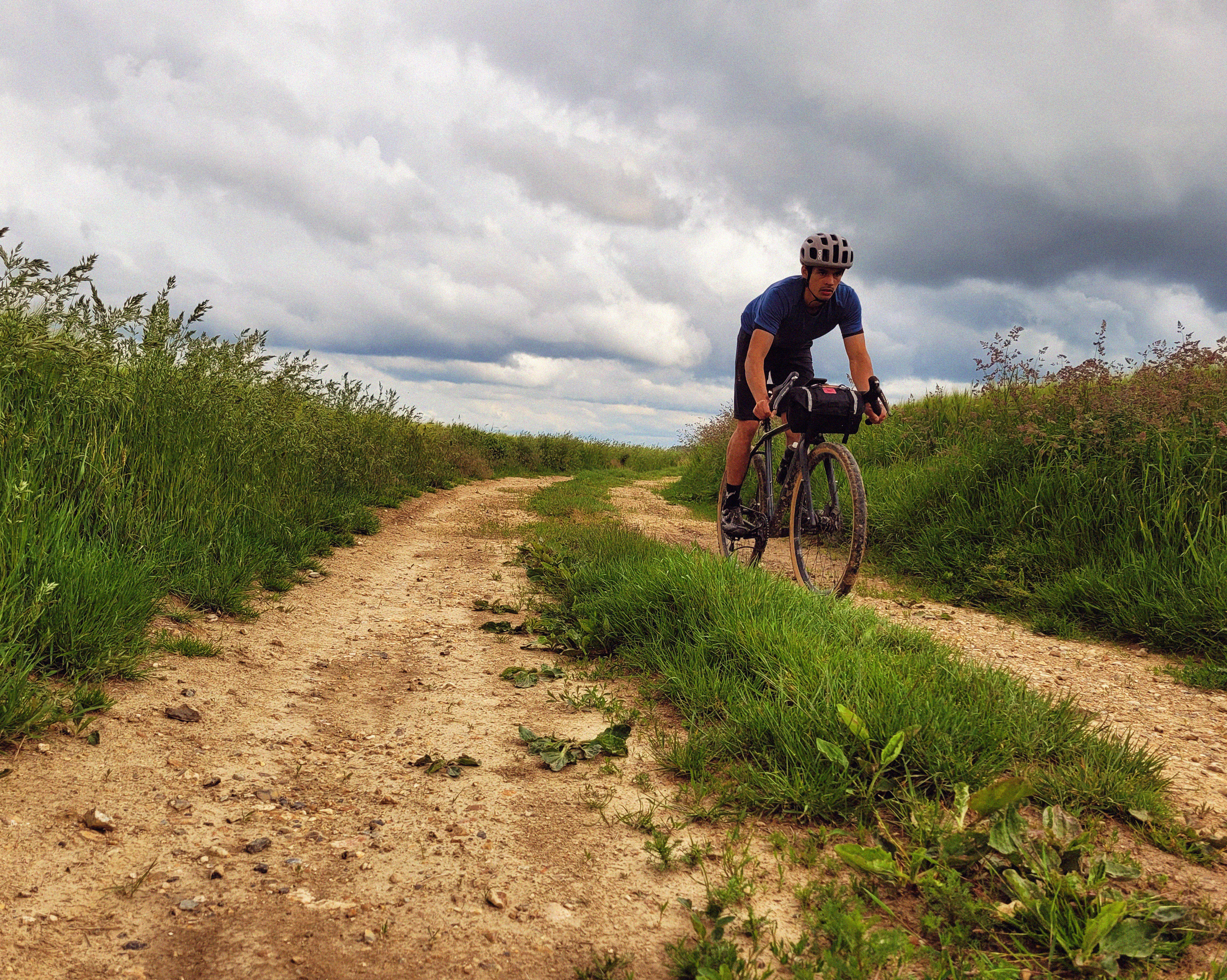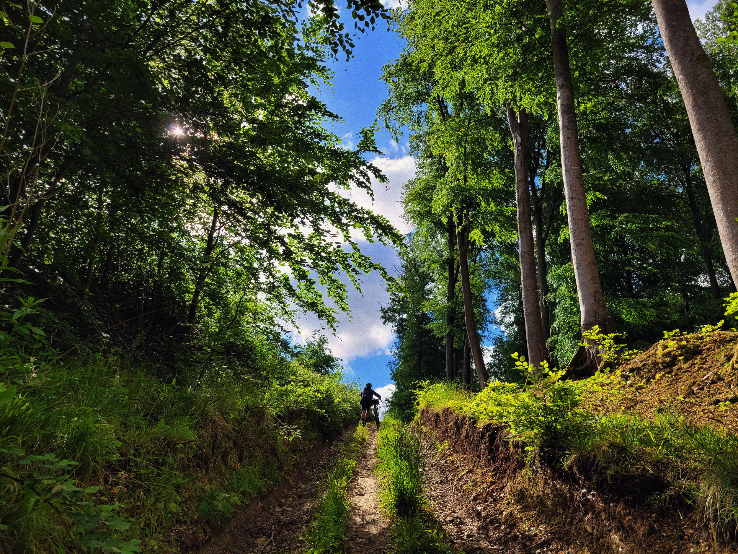 A rut hidden under an overgrown grasstrack to road into another forest. Struggle to find the path in the woodland, obscured by vibrant verdant undergrowth. Swim through pools of light between trees. Slip slide through boggy ground and sludge in and out of stagnant puddles on a straight line carved through the middle of the forest. Must remember this section can be dropped from any future routes. More tyre tracks in the moist earth, a sign that others ride here but we still haven’t seen anyone in five hours. A family of wild boar trot across our path.