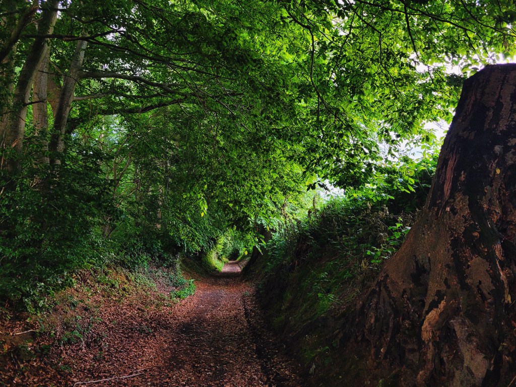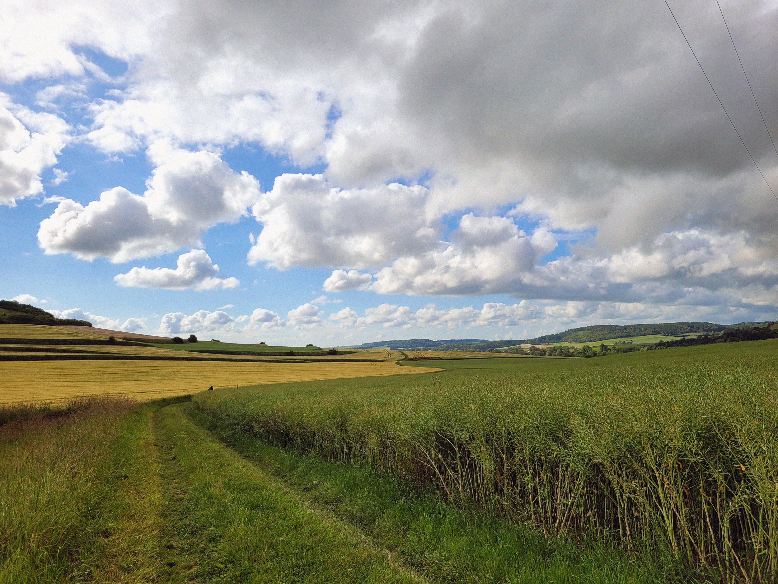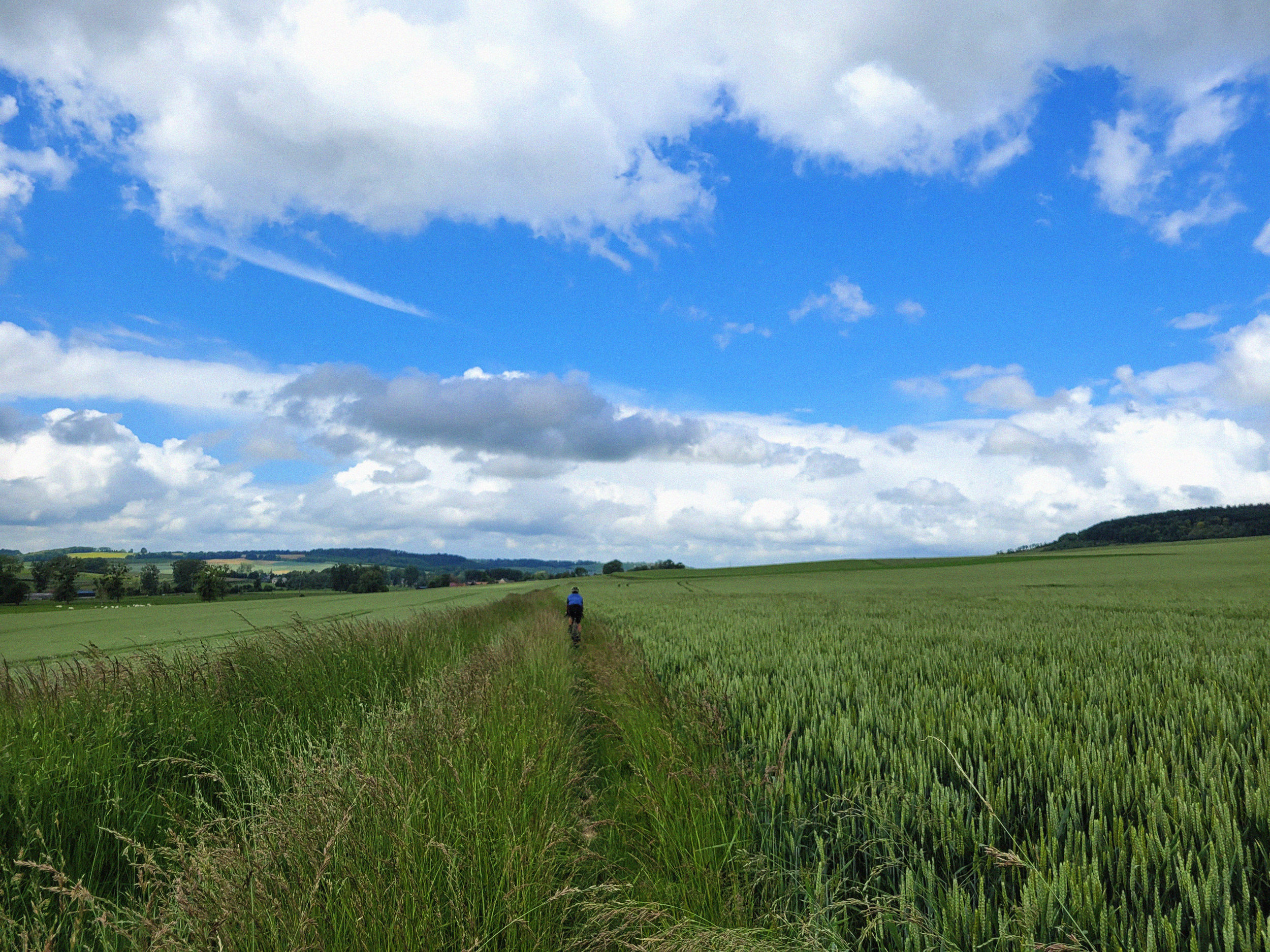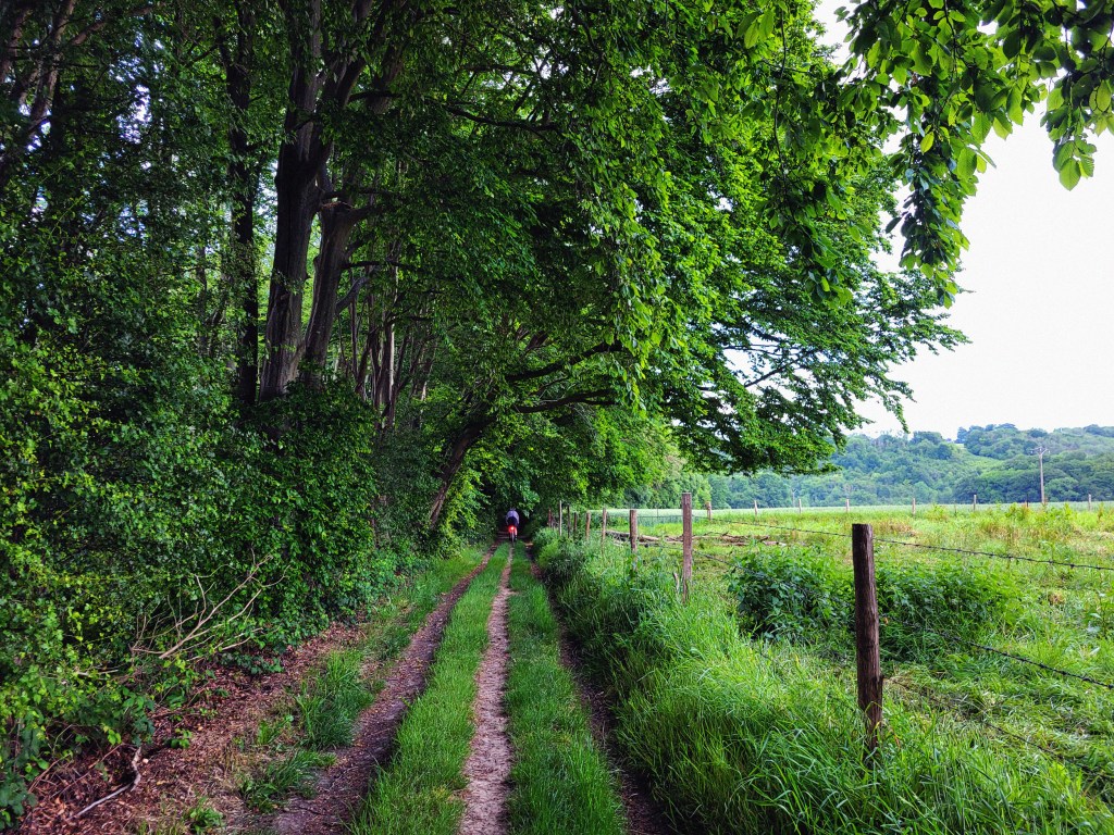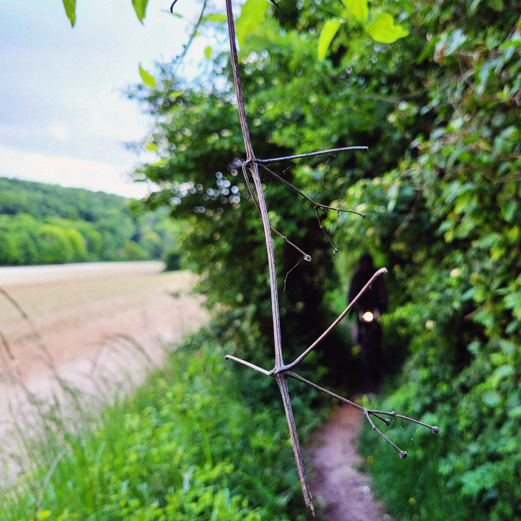 Returning to the forest we climb steadily through birdsong and dappled sunlight. A section of a favourite road over the top of the ridge but rather than the usual snaking descent that brings a smile to the face swerve left into a narrow gap between the trees. The GR plummets down the side of the hill, we slalom lumps of flint and chunks of fallen branches. A view of the wide valley opens ahead as the path widens into a chalky double track. Sharp right turn at the farm and along the valley floor. Waist high grass and wheat whips shins.