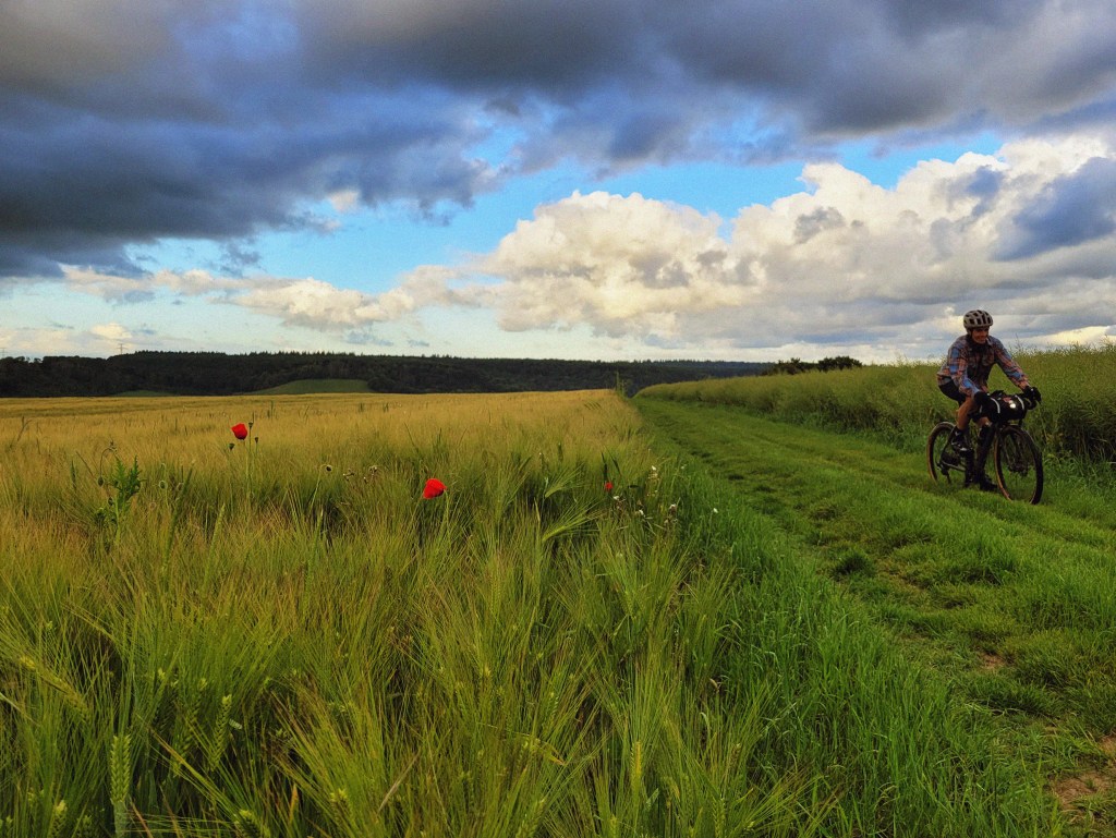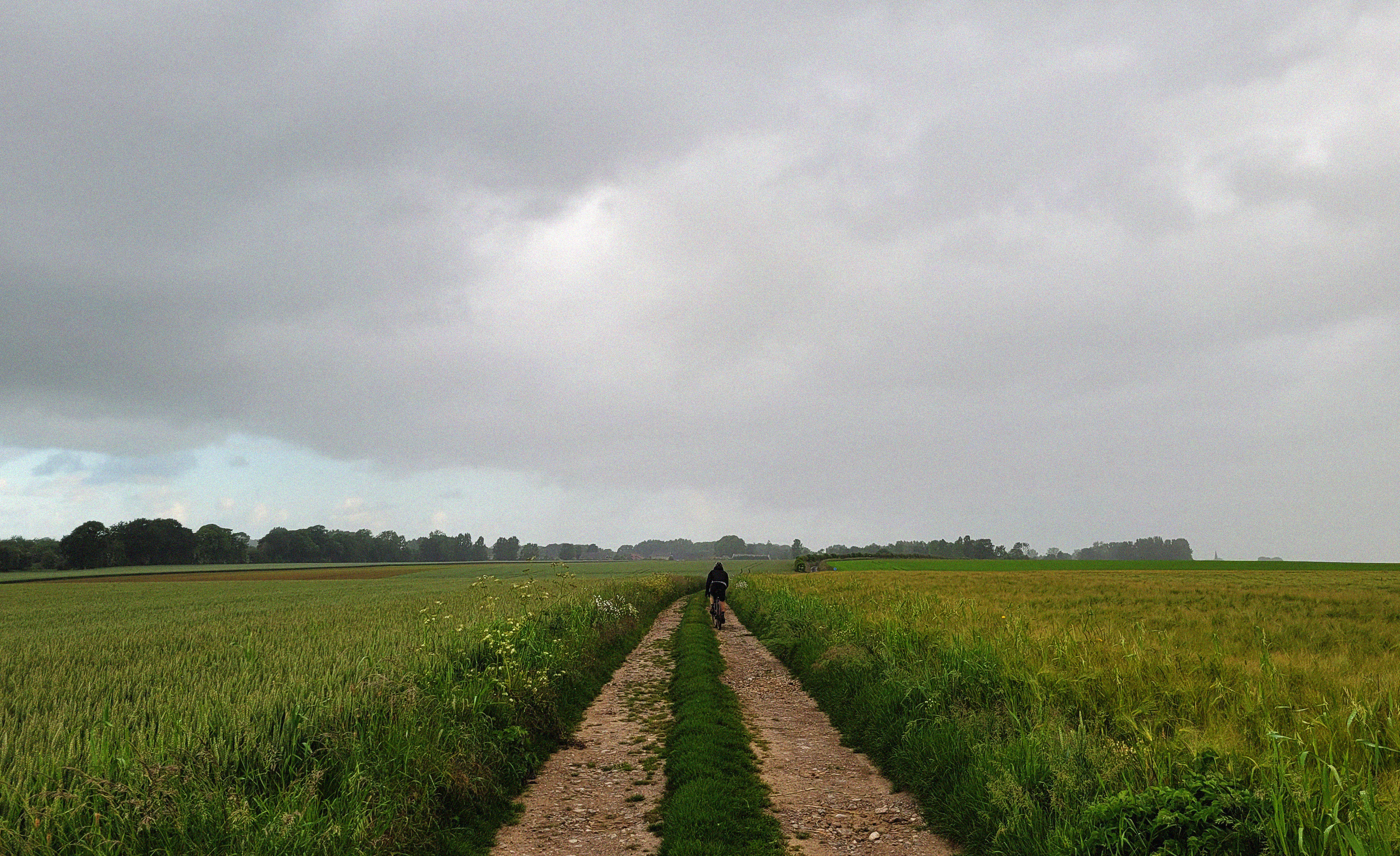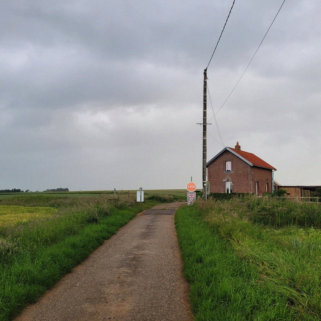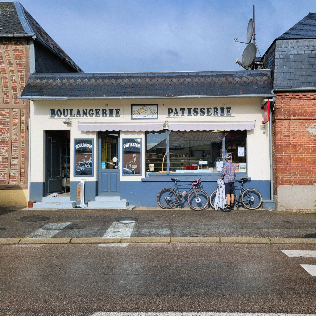 An isolated house stands sentry beside a disused railway line, across the tracks the tarmac disintegrates into gravel and in turn to mud. Rain has started to fall and despite knowing we’re ultimately heading to where we can see blue sky our convoluted squiggle of a route keeps turning back into the rain and the wind. Turn right at a junction rather than straight across, we’ll do this side of a square rather than the other three just to end up at the same place. Hopefully a bit less time spent under damp clouds. Rumble over tractor tyre tracks in the mud between fields. Wet brakes squeal on a swooping tarmac descent to Sept-Meules, a placename I’ve seen on signposts for ten years but never actually been through. A not so inbetween place between the inbetween places I tend to ride. Nice looking church. Rolling along the road we exit from under the rain and fork onto a grass track beside a field of barley and poppies that slowly rises and morphs into a rooty flinty climb between brambles. A couple of field edges lead us towards a church spire and an open patisserie.