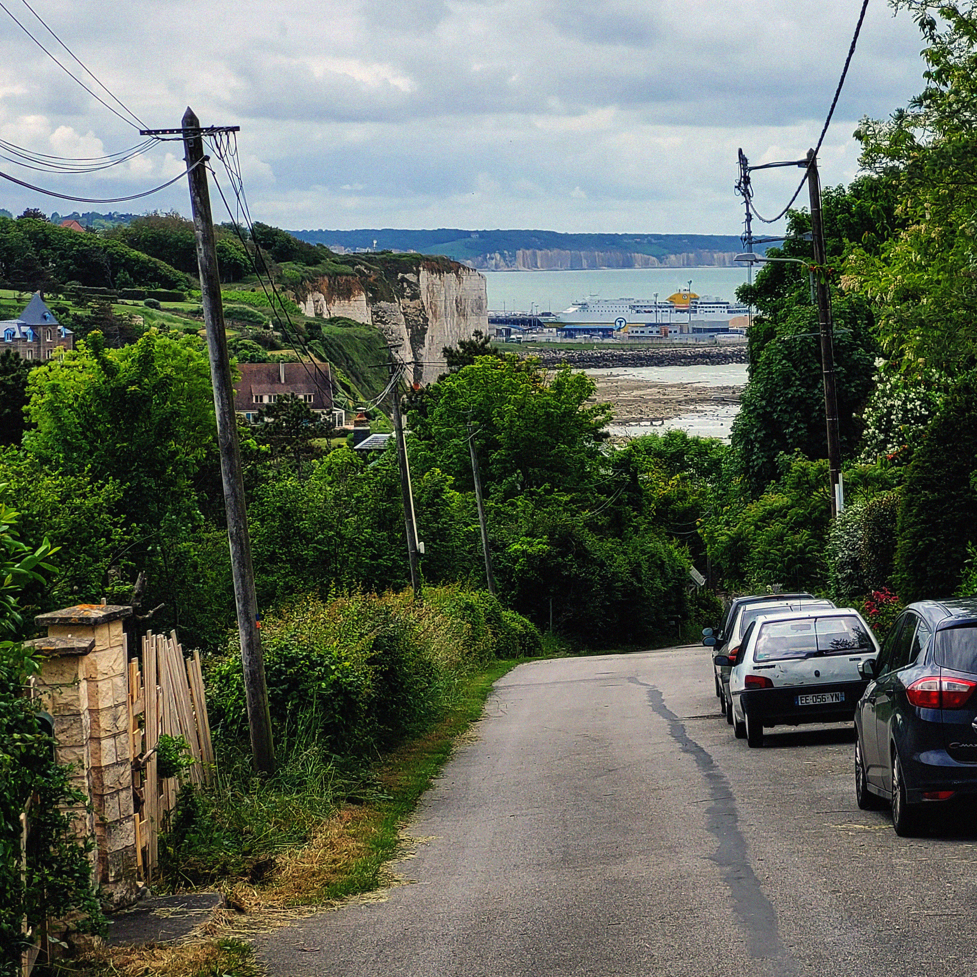 One last bit of edgelands… dart behind the back garden gates for a gravel track between the houses and cliff edge. In a dip in the land our ferry home appears cruising into port. The path narrows to what might be a footpath but a walker we pass doesn’t grumble. Steps and a barrier, yep this is probably a footpath. The ferry within the harbour walls directly ahead. A Canadian war memorial, one of many along this stretch of coast, in the narrow gap between the cliffs. One final climb of the day to get us over the cliffs into Dieppe.