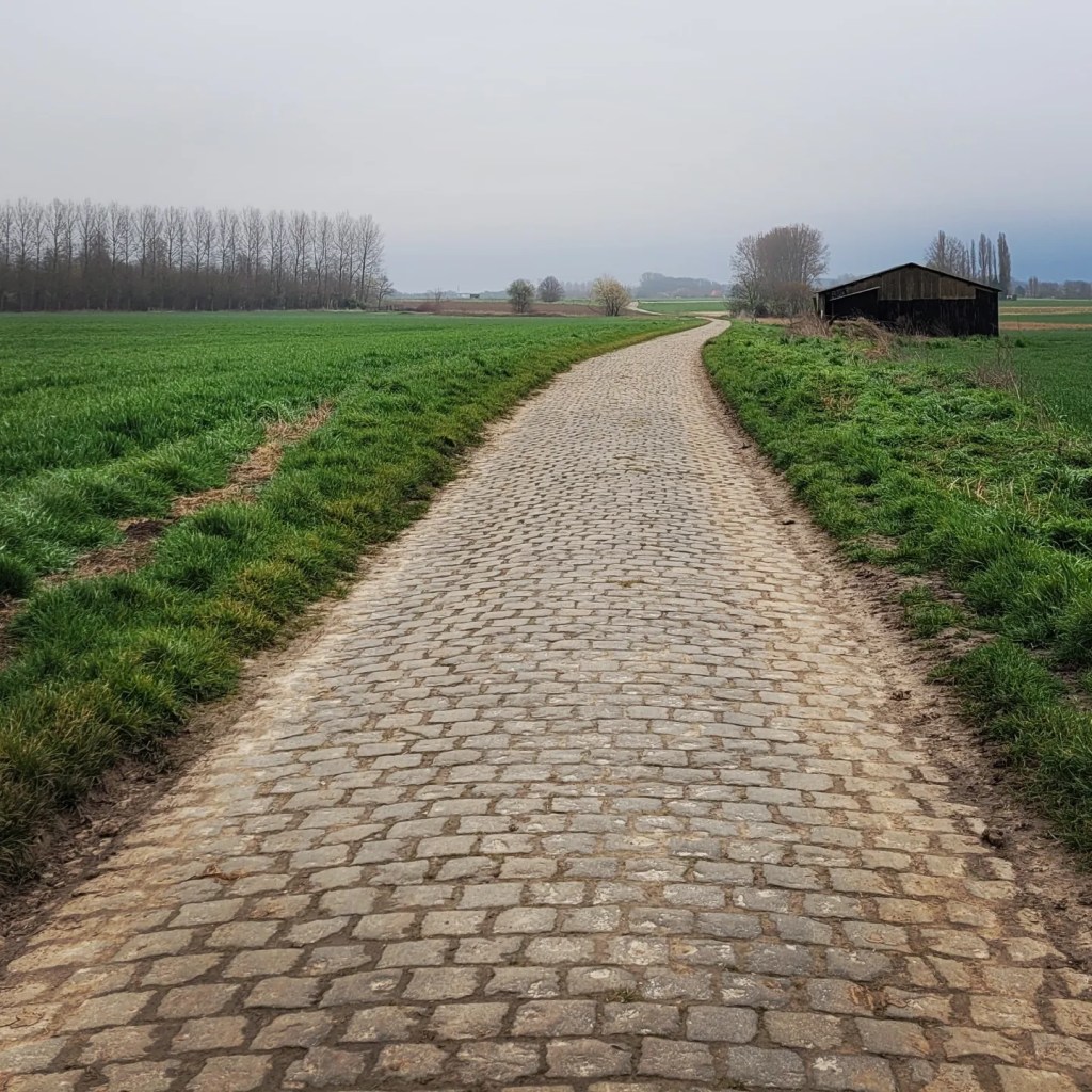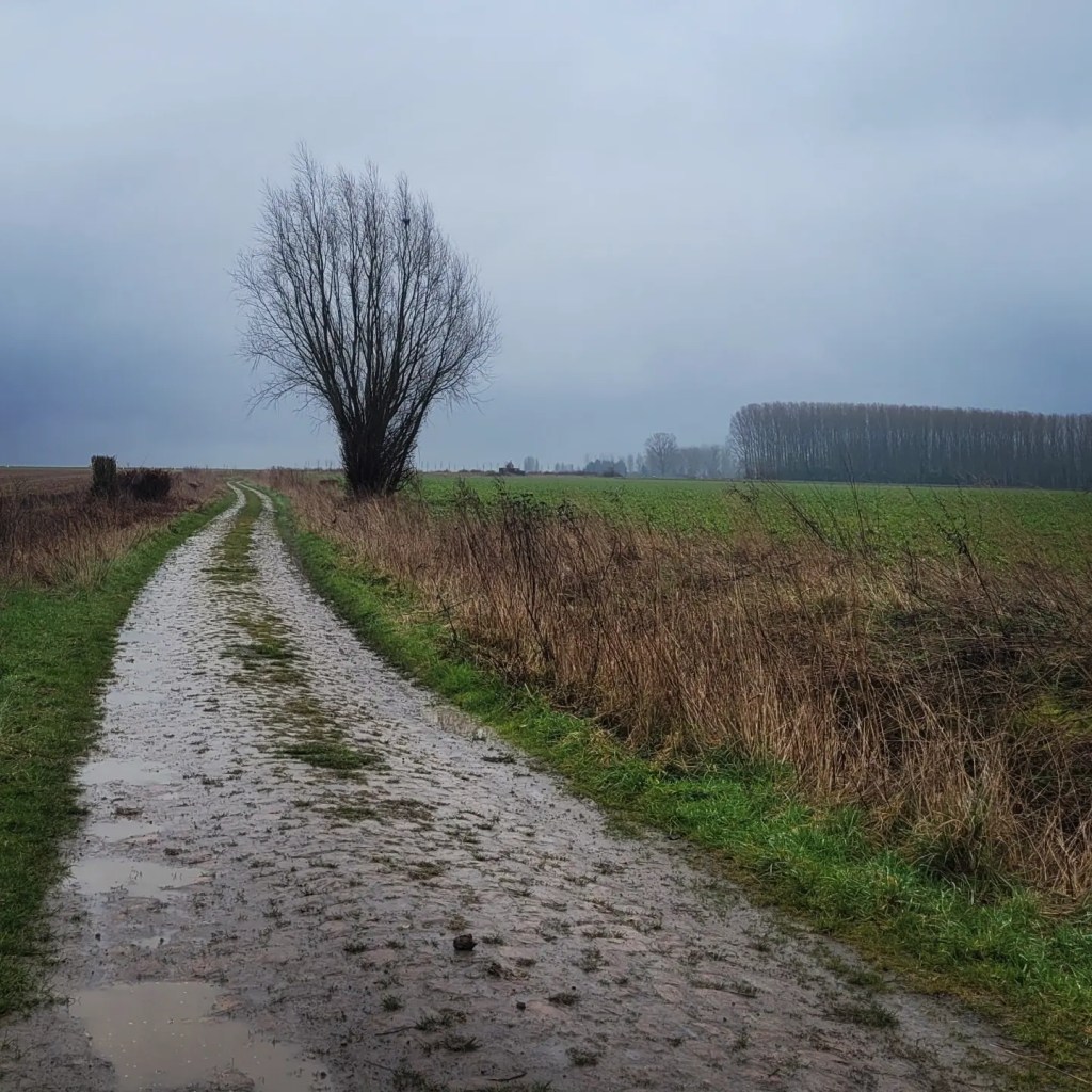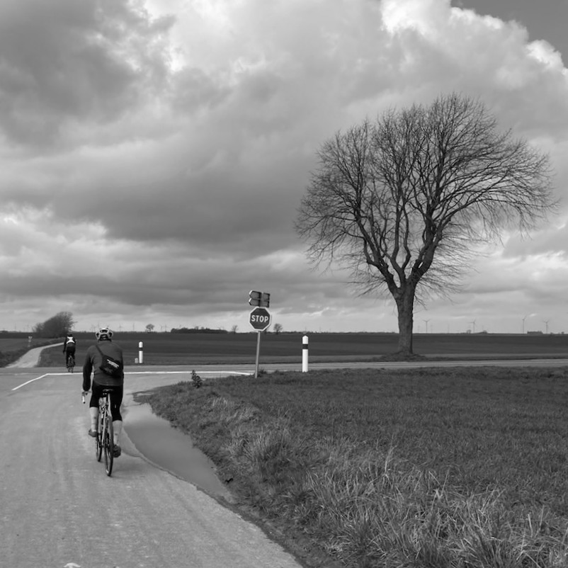 Intersecting lines, motorway overhead, railway below. Signs point to places in a different country. Bus stops, metro stations, tram lines. Severe concrete outskirts, roundabouts and conflicting angles, stripes and chequerboards painted on tarmac, kebab shops and tattoo parlours, chain hotels and car dealerships, fast food and deserted offices. Torn edges, scruffy urban collage, new parts stuck over old parts, the past leaks through. Pictures framed between pillars and flyovers. Alphaville and bits of monochrome road movies play in my head: Alice In The Cities, Radio On. Black and white dirties to grey-brown as we pull ourselves from the city. Horizon blurred. A bend in the road, the smell of cow shit. Rumble and clatter over a cobbled farm track. Château d’eau and cooling towers scattered. Scratch cards and coffee trying to avoid the rain… an hour and half and 35km later gloves and buffs dry out on a radiator in a bright orange burger joint. Sleepy Sunday villages. Metal shutters pulled down over windows. Haunted châteaus. Wheels slide on mud splattered pavé. Pylons stride across the fields as once did young men now laying beneath orderly bright white tombstones. L’enfer du Nord. The light drains behind the horizon. This morning’s roads backwards, brightly lit in neon and LED. Return through Alphaville, now the unprinted negative.