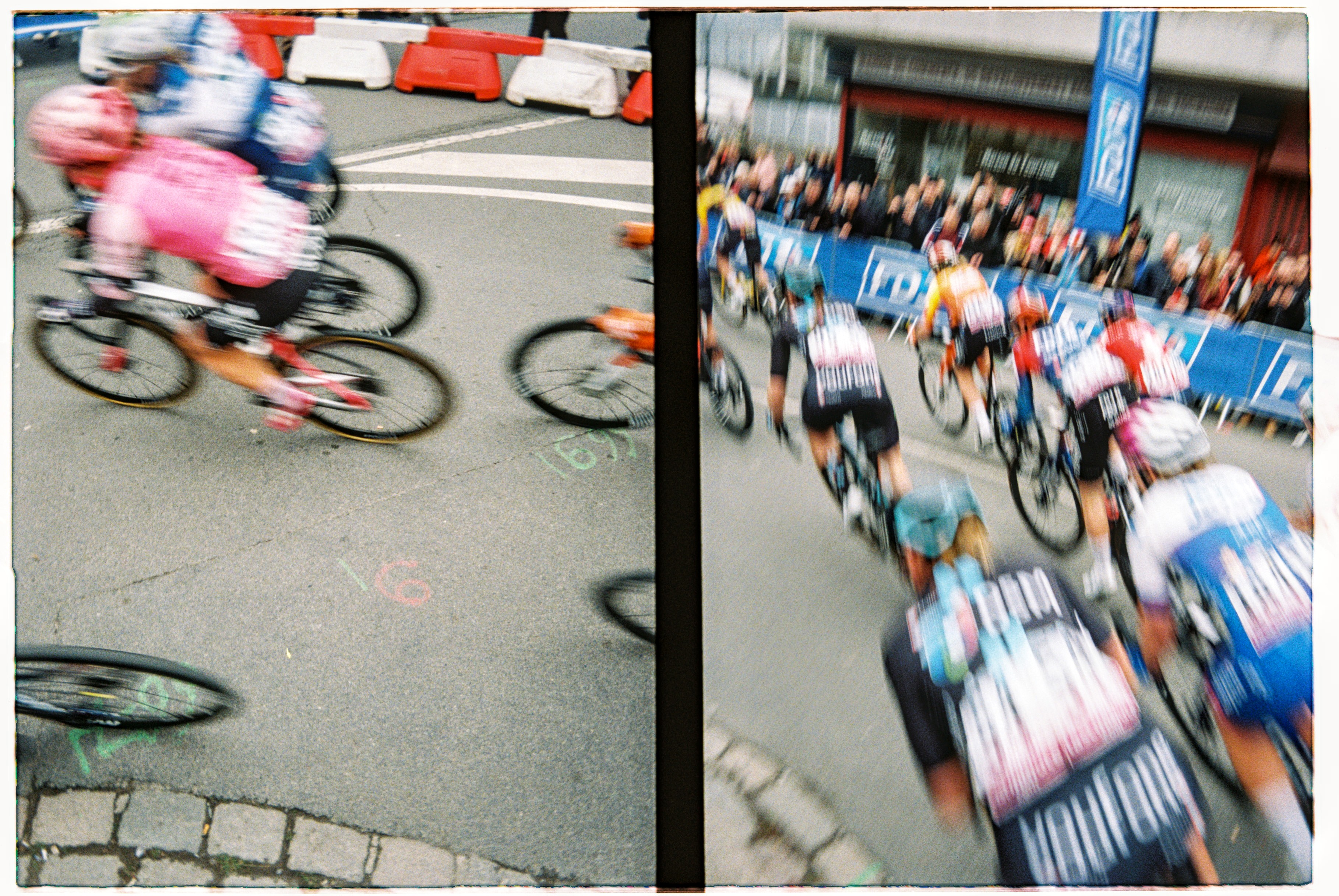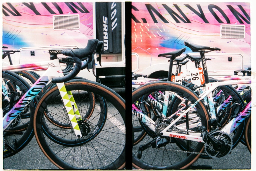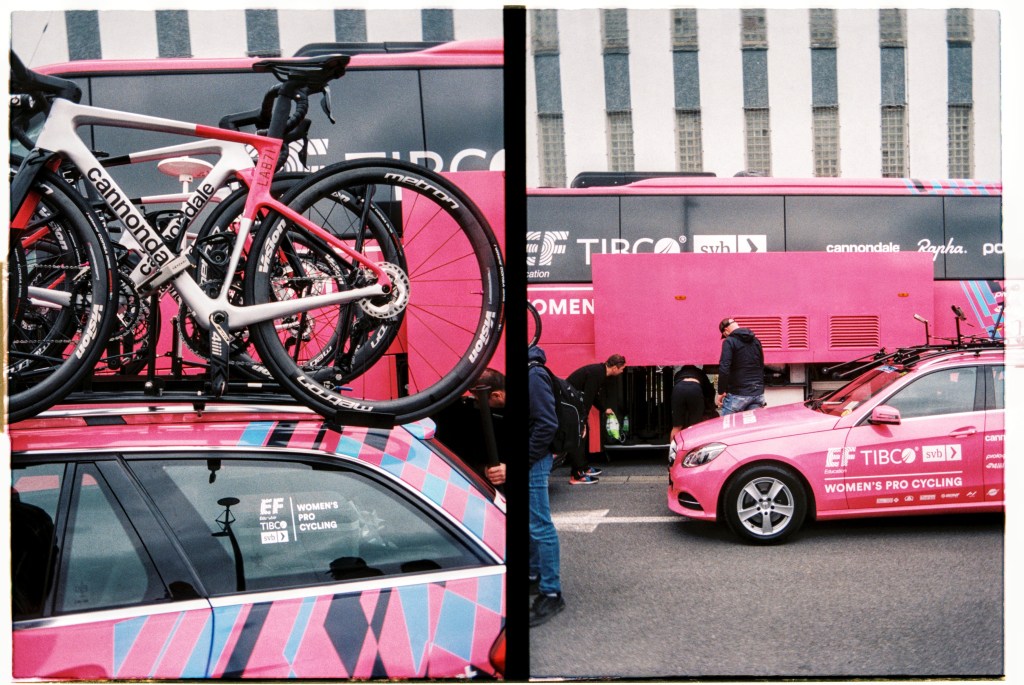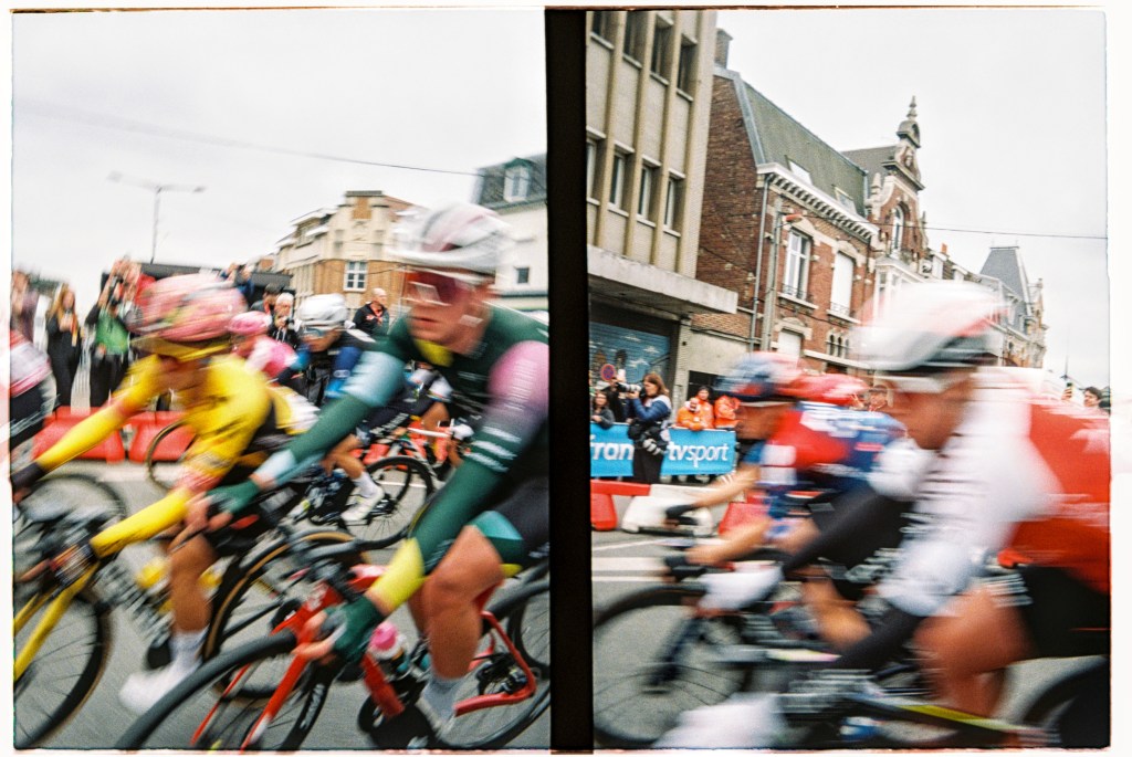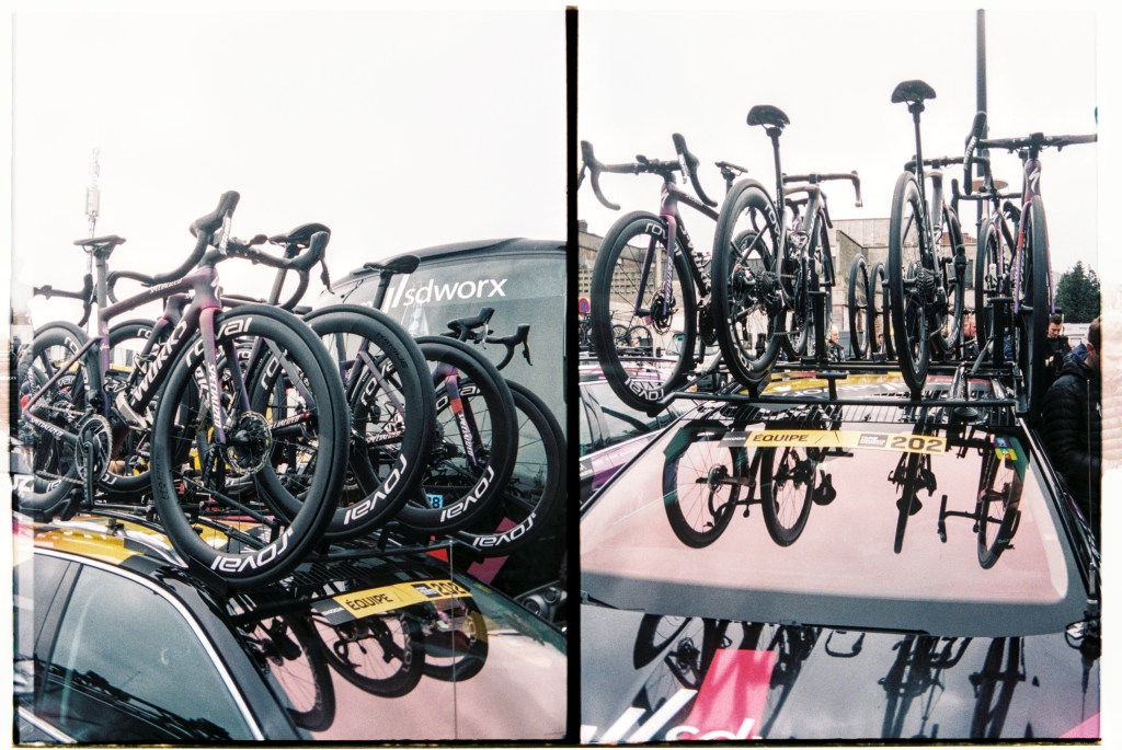 Hop off the tram next to where the shiny brightly coloured logo splattered buses are parked up. Fans milling about as mechanics fettle. Expensive carbon fibre and fancy paint jobs reflect in windscreens. Accreditation badges hang round necks, television cameras sit on shoulders, microphones clutched in hands. Lotte Kopecky chats to a television crew before taping notes to her stem. She won Flanders last weekend and a favourite for today. Point at fancy bits of kit and bump into a friend from home. Coffee on the terrace of a PMU bar in the middle of things. Flags draped over barriers and fans’ shoulders. One by one the teams are rolled out to be presented to the growing crowds. French riders get the biggest cheers. Spin to the start line, a count down… a lap of town… wait… The line of photographers opposite stop chatting, cameras raised, a wave of applause breaks on the adjacent street, a squeal of brakes, the clunk of gears… blurs of colour… wait… A second lap and they are gone. People drift away. Barriers slung onto trucks as we wander back to the tram after a quick beer in the PMU. “Home” in time for television coverage to start as they hit the first secteur. Bottles of Leffe retrieved from the fridge. Settle in for the rest of the afternoon.