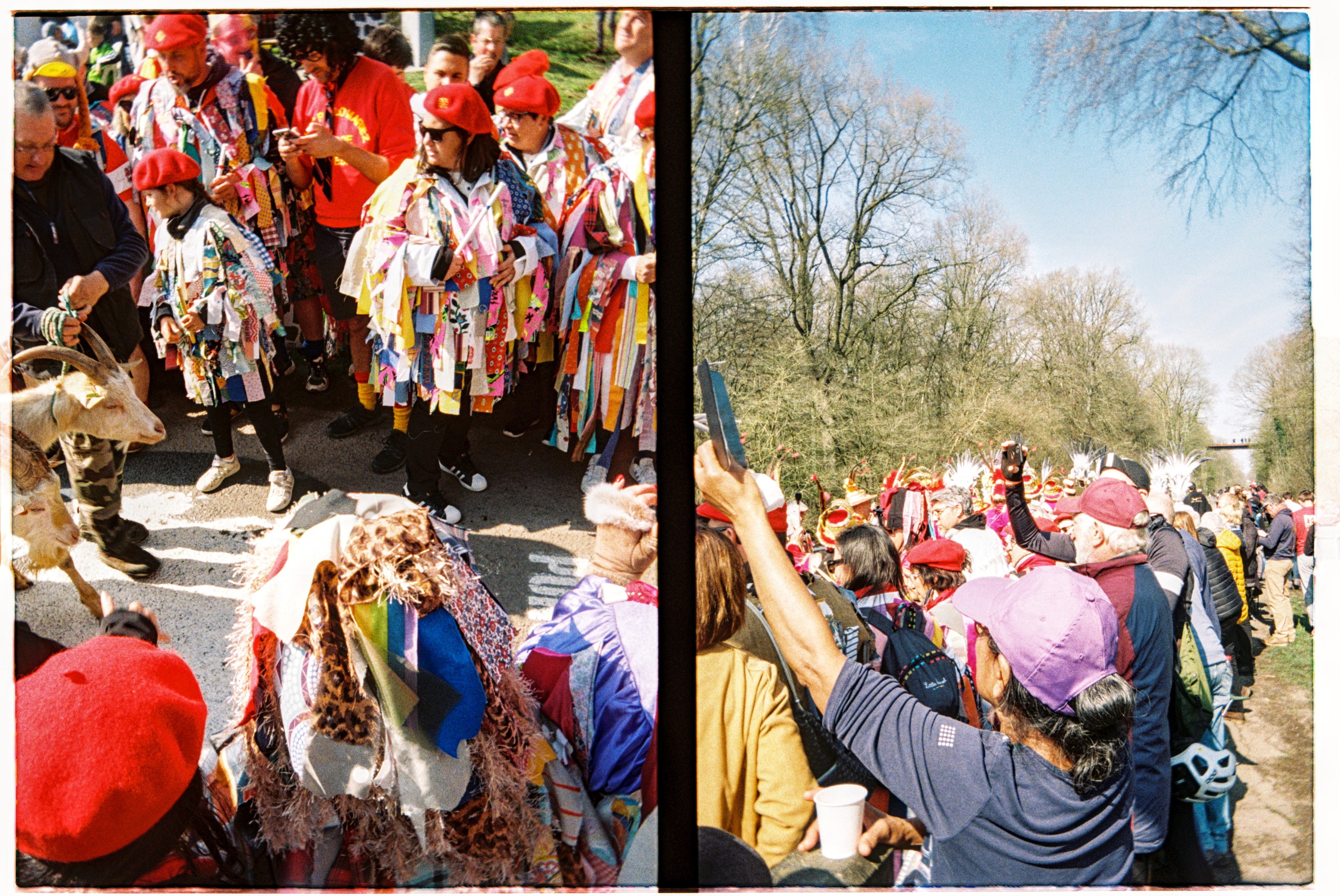 We skip around the closed road signs. We can hear our destination before we see it. Belgian flags and satellites dishes adorn a field of campervans. Dump the bikes. Crowds and noise and the smell of chips and locals in homemade costumes of fluttering colours and television crews film drag queens in gold trimmed fuschia and sunshine glitters on scantily clad space age disco samba dancers and a couple of nonplussed goats are paraded past. Sensory overload carnival time. Watch the big screen, count the kilometres down. Helicopter shot of where we’re standing and then the cooling tower we passed two days ago. They are getting near, television shots of the other end of this road. Lean over the barrier and stare up the road, anticipation condenses into excitement. Hands bash barriers, voices raised. The leaders appear to gracefully float onto the cobbles, the chasing motorbikes and cars rumble and rattle. Red smoke drifts. The sound of rotors spinning just above the trees. Glance at the big screen then back up the road, the rest are coming… flashes of colour, riders then cars, everything slows suddenly, heads turn to screen, a collective gasp, a big crash. A mechanic grabs a bike from a roof and starts running. Riders playing catch up chase the race past the queued cars. Then it’s over.